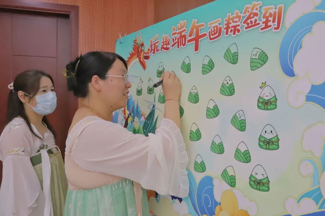 在金水佳苑◈✿,一场让人身临其境的汉服游园会同样引人驻足◈✿。为让本次端午节更具国风韵味◈✿,在签到点◈✿,工作人员们穿上汉服引导居民们在签到板上根据自己的喜好画上专属自己的端午表情◈✿。